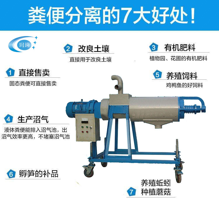 现代化畜禽养殖业的发展,工厂化集约化养殖的兴起,丰富了人们的物质需求,但也带来了畜禽污水的泛滥,造成了对水源、空气、环境的污染。猪粪处理机是畜牧养殖场畜禽粪便粪污脱水的一种环保设备,它能将猪粪等禽畜粪便原粪污水分离为液态有机肥和固态有机肥。液态有机肥可用于农作物利用吸收,固态有机肥可运到缺肥地区使用,也可起到改善土壤结构的作用,同时经过发酵可制成有机复合肥。用配套的液下泵将原粪水送至猪粪脱水机内,通过安置在筛网中的不锈钢螺旋轴,挤压分离出固态物质(干粪),液体则通过筛网从出液口流出。