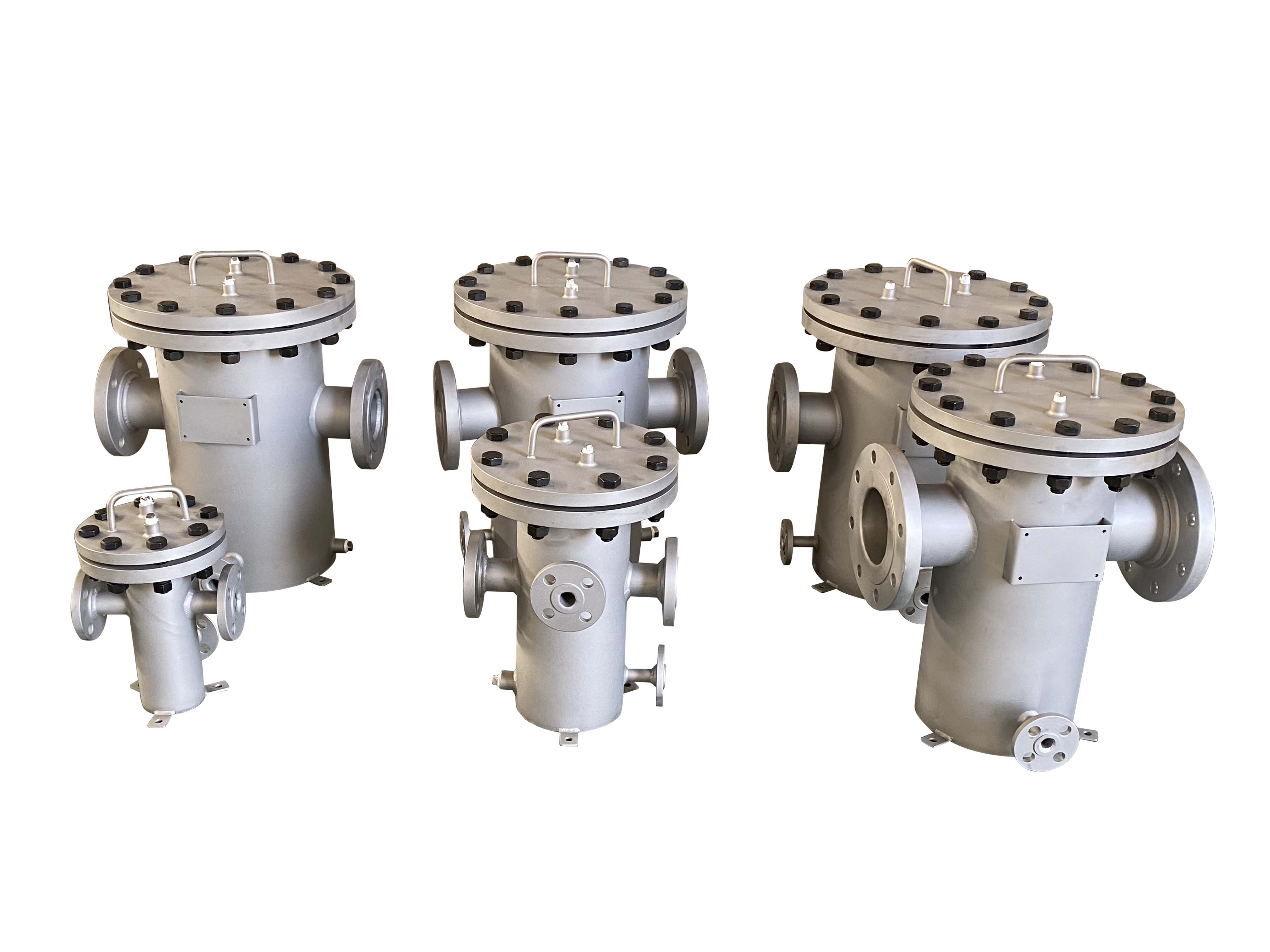 篮式过滤器主要由接管、主管、滤篮、法兰、法兰盖及紧固件等组成。当液体通过主管进入滤篮后,固体杂质颗粒被阻挡在滤篮内,而洁净的流体通过滤篮、由过滤器出口排出。当需要清洗时,旋开主管底部螺塞,排净流体,拆卸法兰盖,清洗后重新装入即可,因此,使用维护极为方便。
