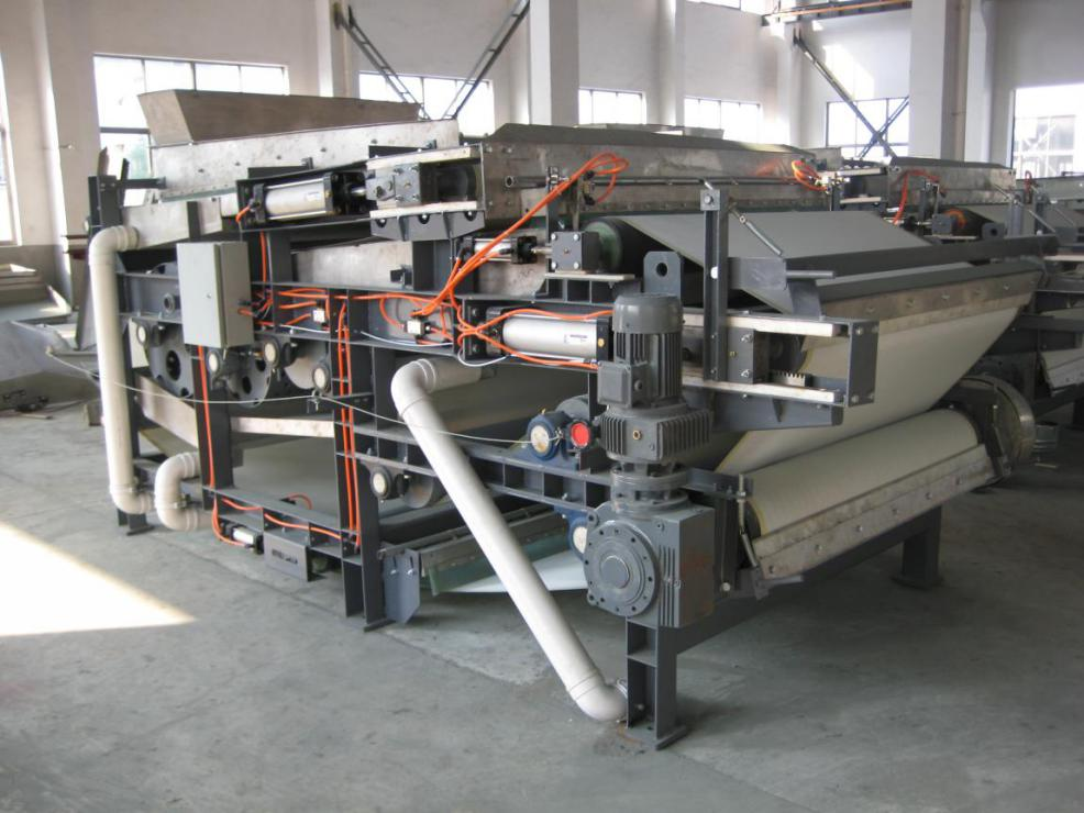 其工作过程是经好絮凝处理后的污泥进入污泥布料机构后,首先经重力脱水区,这一段为较长的水平运动段和很小角度的上升段;滤将在滤带上随滤带一起动;在重力作用下,自由水与絮团分离,脱除滤浆中大部分的自由水,滤浆基本失去流动性。然后进入楔形空间由小到大,最后两滤带合拢,使夹在滤带中间的滤浆受到的挤压力逐步加大,水分不断的从滤浆中排出。此时泥浆已失去流动性,为下一步进入压榨脱水区做好准备。压榨脱水区的压榨辊按直径由大到小顺序排列,滤浆受到的压榨力由小逐渐增大。经数个呈S形排列的压榨辊对滤饼的压榨、错水剪切后,滤浆脱去大部分的饱和水,完成对污泥的脱水。滤带经过卸料装置时,泥饼被刮刀从滤带上刮落。上下滤带经清洗再生后重新返回重力脱水区,完成下一步污泥脱水循环。