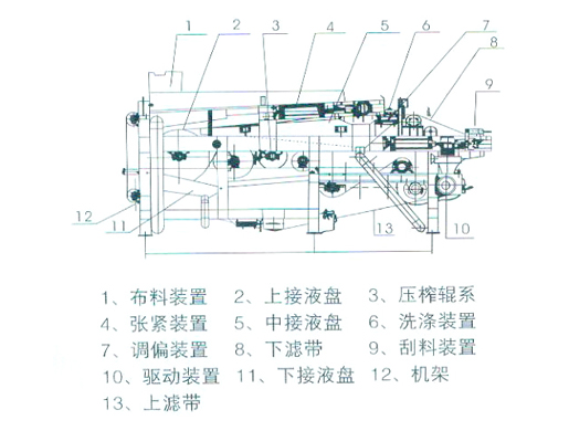 DY系列带式压榨过滤机主要由驱动机构、污泥布料机构、滤带、张紧机构、自动调偏机构、滤带冲洗机构、刮泥机构、重力脱水区、楔形脱水区、压榨脱水区、机架等组成。